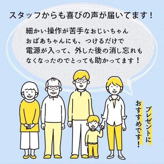 細かい操作が苦手なおじいちゃん、おばあちゃんにも、つけるだけで電源が入って、外した後の消し忘れもなくなったのでとっても助かってます!