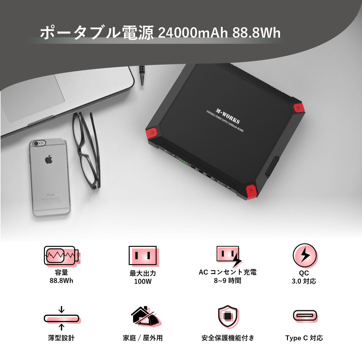 【大容量&高い互換性】24000mAhのバッテリー容量を備えて、キャンプ、車中泊、アウトドアから防災まで幅広くご使用いただけます。